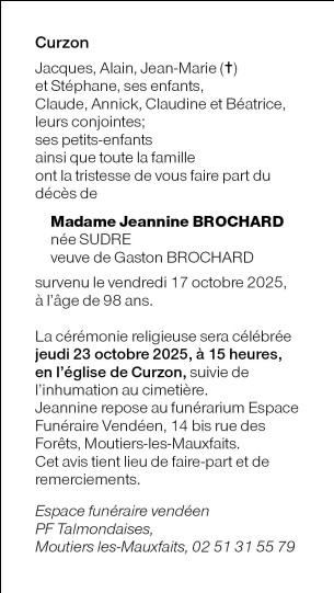 Fallecida en La Roche-sur-Yon (85000, Francia) el viernes, 17 de octubre de 2025 a la edad de 98 años