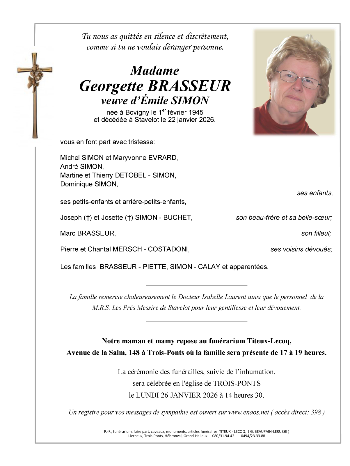 Fallecida en Stavelot (4970) el jueves, 22 de enero de 2026 a la edad de 80 años