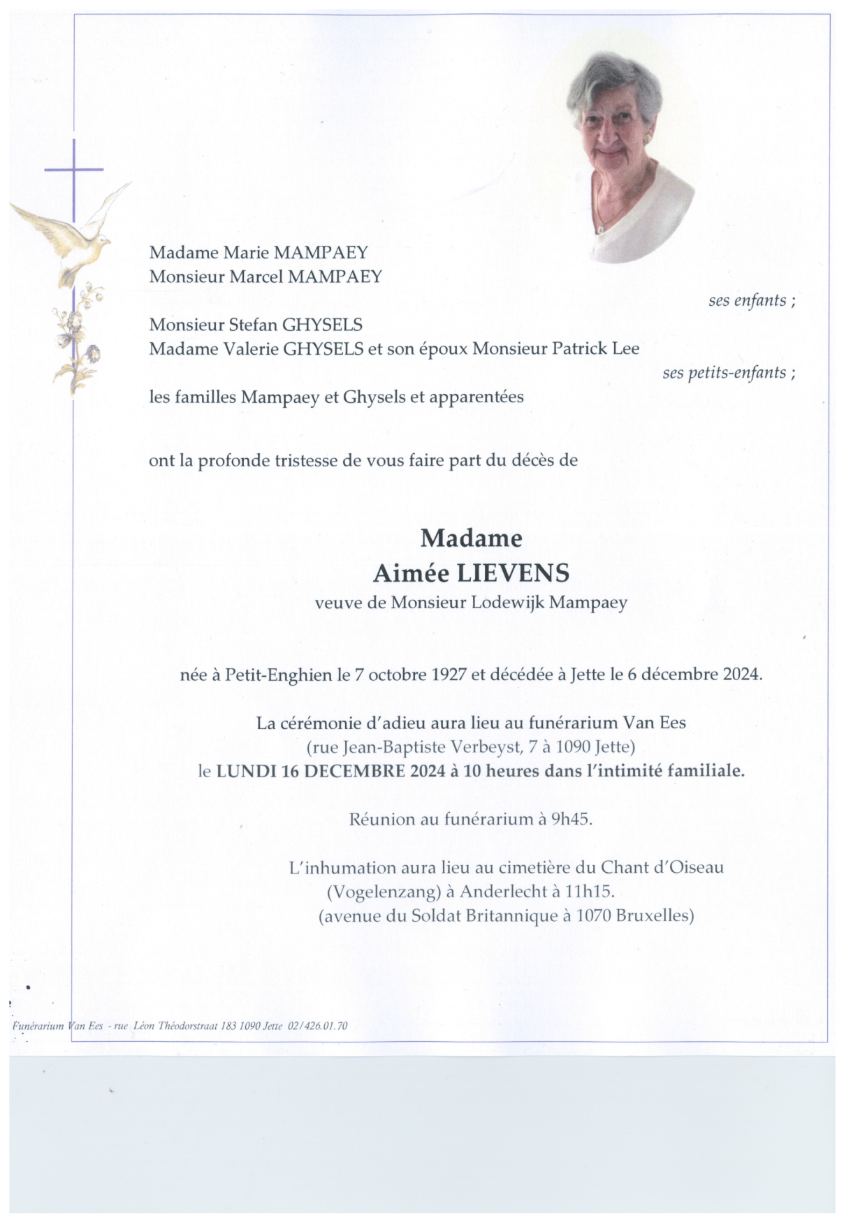 Fallecida en Bruxelles (Jette) (1090) el viernes, 6 de diciembre de 2024 a la edad de 97 años