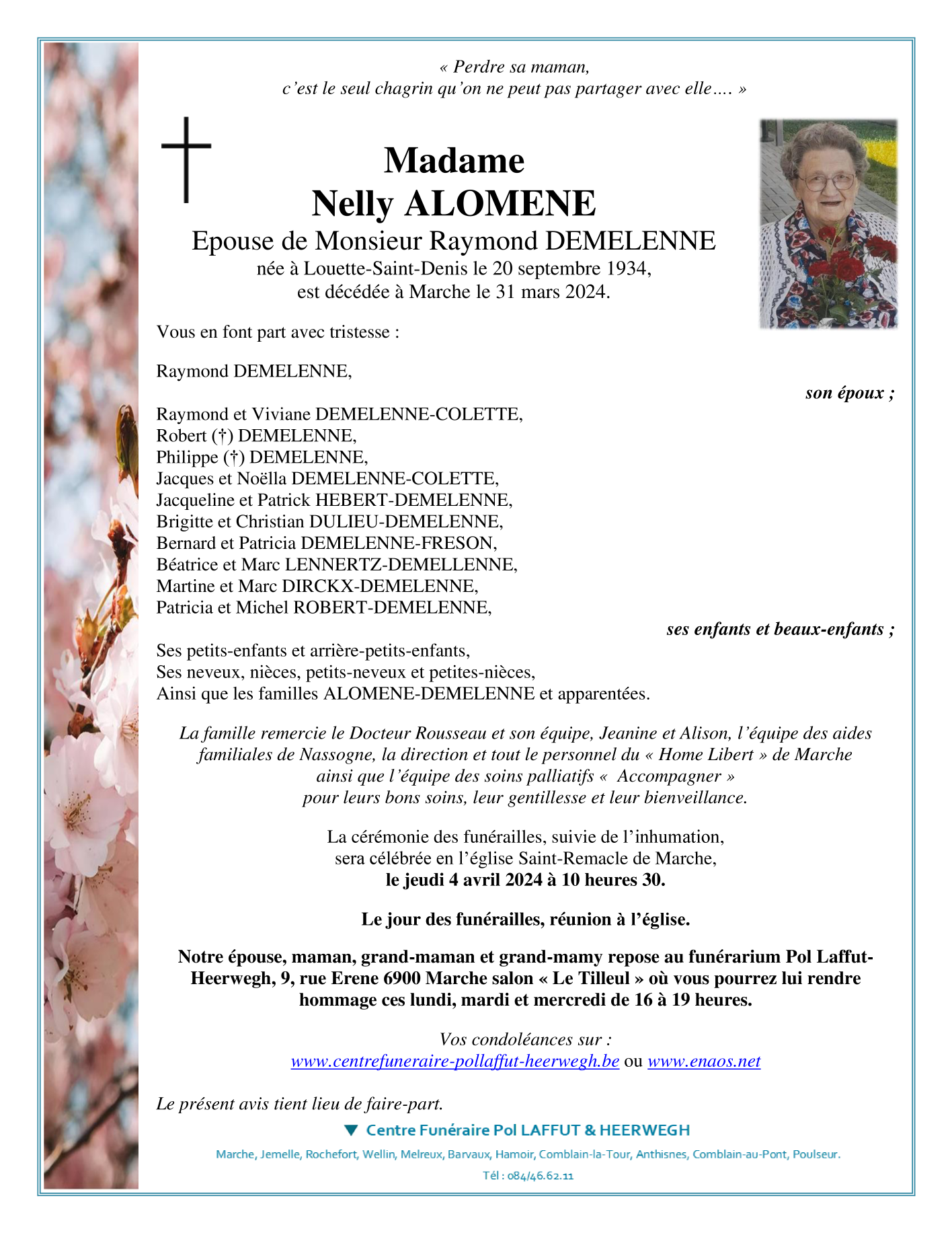Décédée à Marche-en-Famenne (6900) le dimanche 31 mars 2024 à l'âge de 89 ans