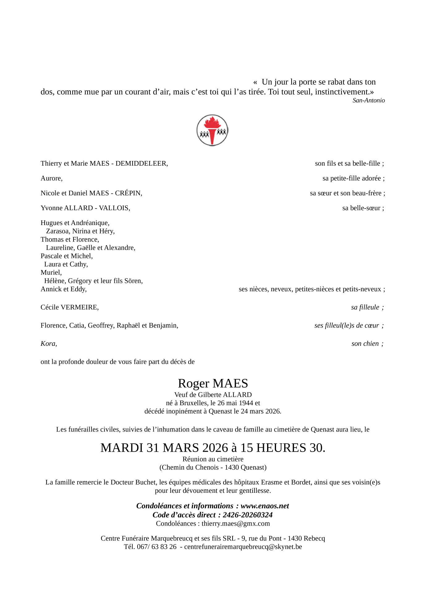Décédé à Rebecq (1430) le mardi 24 mars 2026 à l'âge de 81 ans