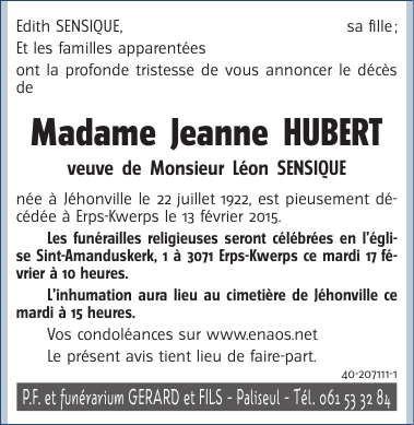 Décédée à Erps-Kwerps (3071) le vendredi 13 février 2015 à l'âge de 92 ans