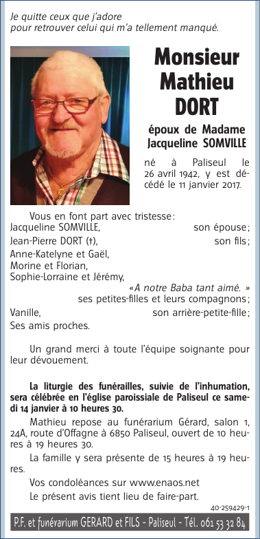 Died in Paliseul (6850) on 11 January 2017 at the age of 74 years