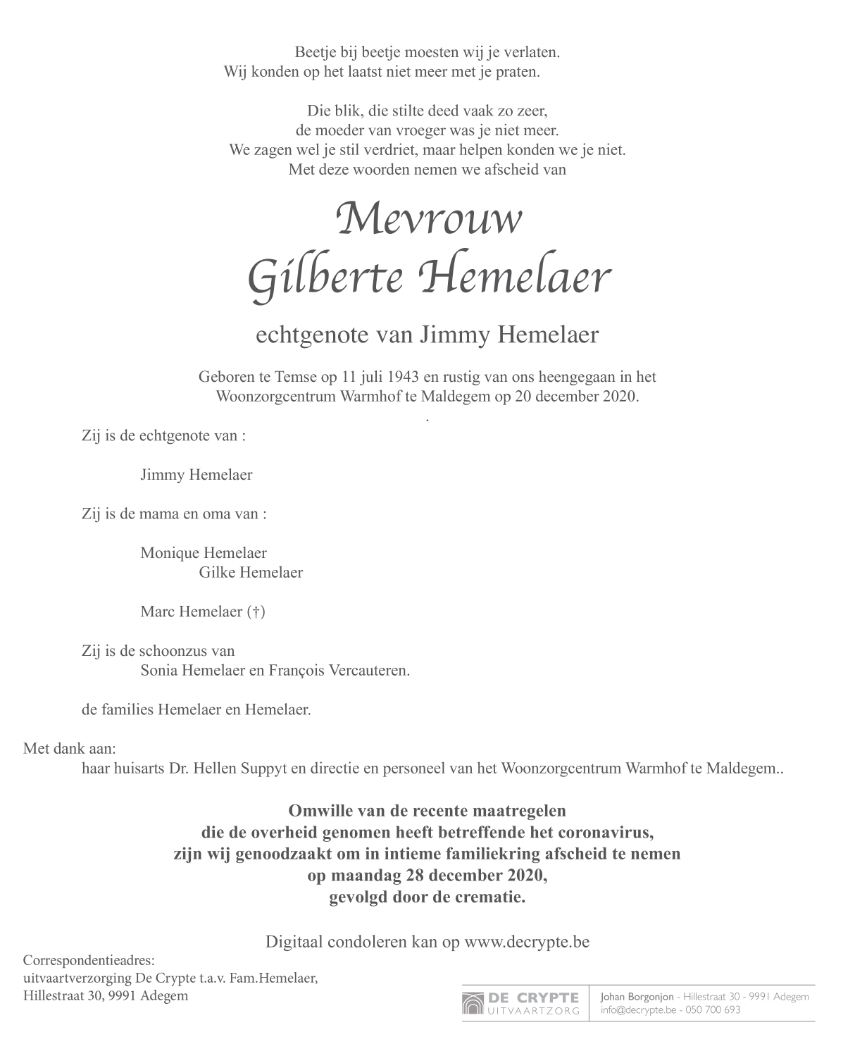 Décédée à Maldegem (9990) le dimanche 20 décembre 2020 à l'âge de 77 ans