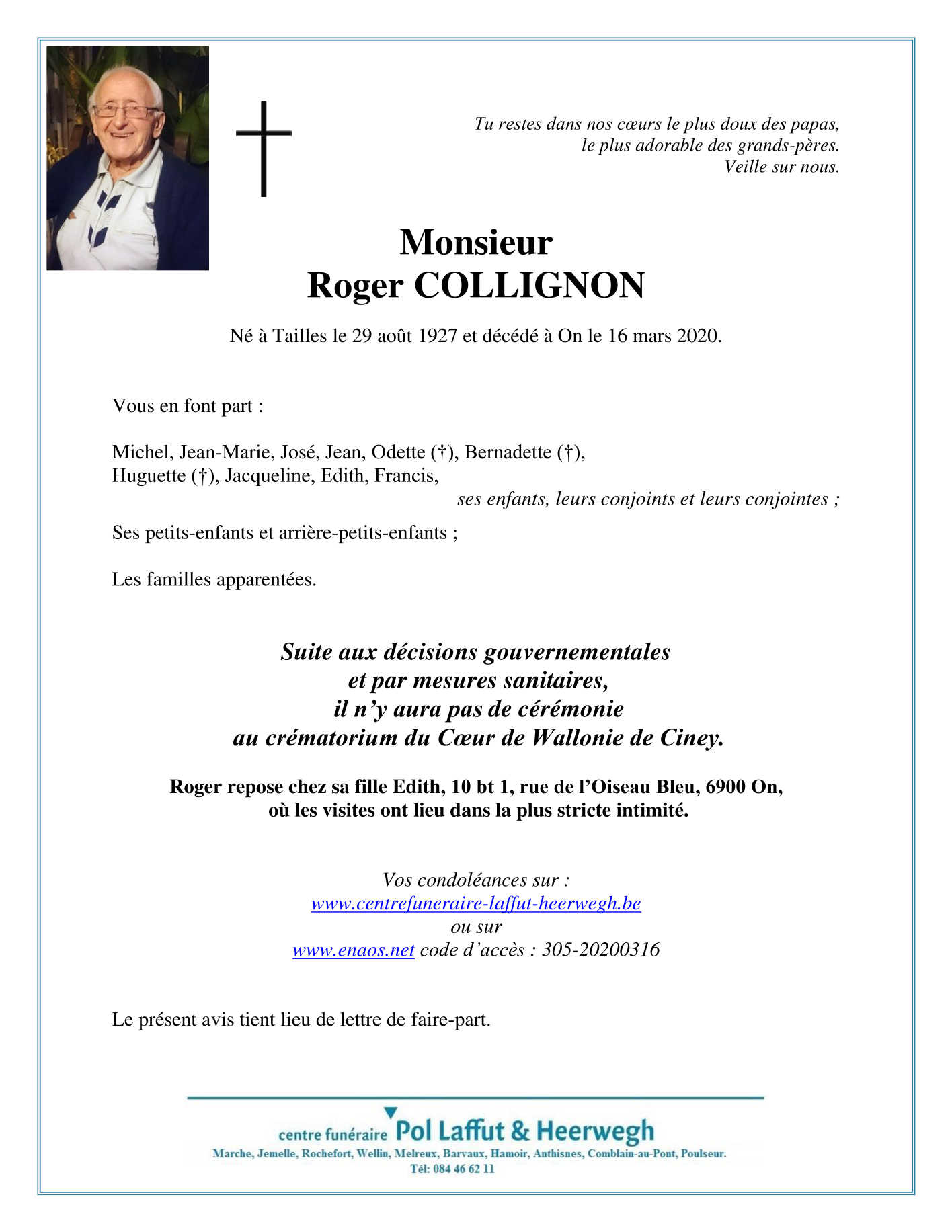 Décédé à On (6900) le lundi 16 mars 2020 à l'âge de 92 ans
