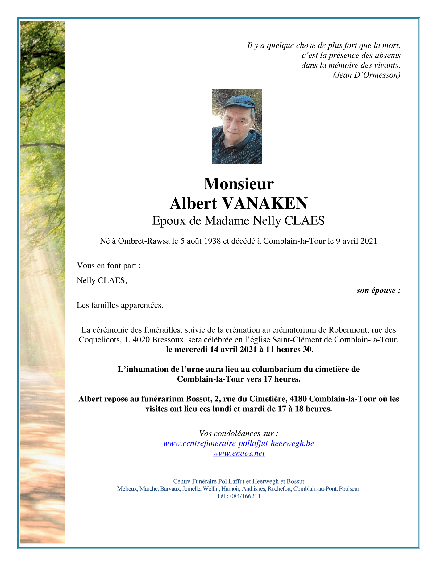 Décédé à Comblain-la-Tour (4180) le vendredi 9 avril 2021 à l'âge de 82 ans
