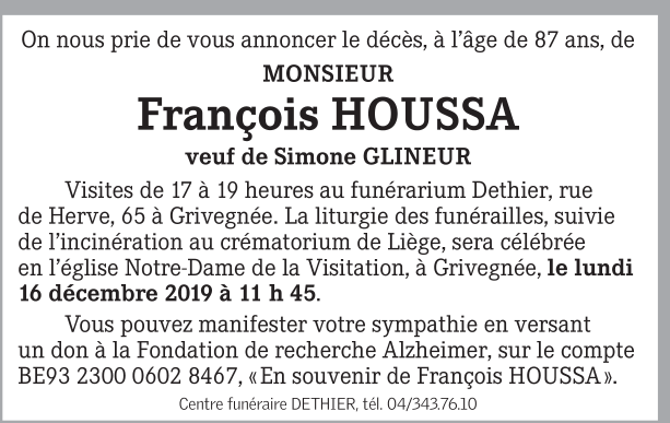 Fallecido en Embourg (4053) el miércoles, 11 de diciembre de 2019 a la edad de 87 años