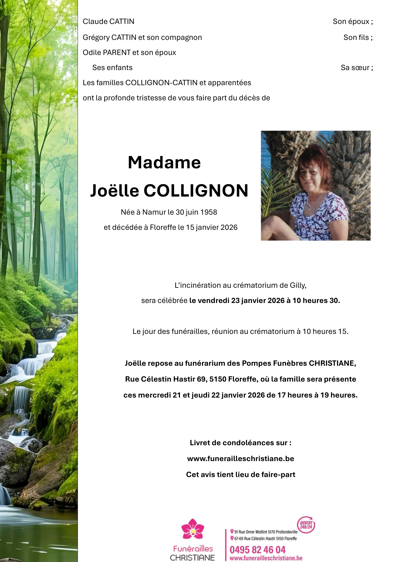 Décédée à Floreffe (5150) le jeudi 15 janvier 2026 à l'âge de 67 ans