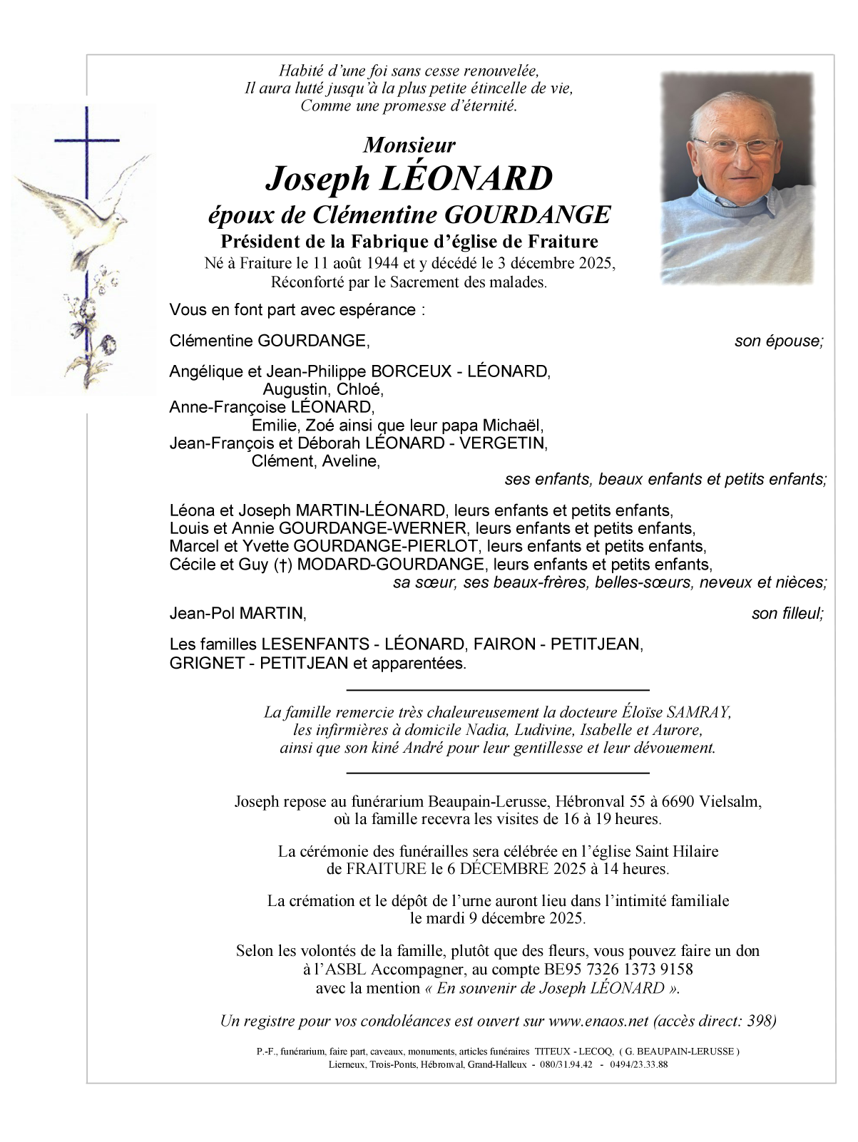 Décédé à Fraiture (6690) le mercredi 3 décembre 2025 à l'âge de 81 ans