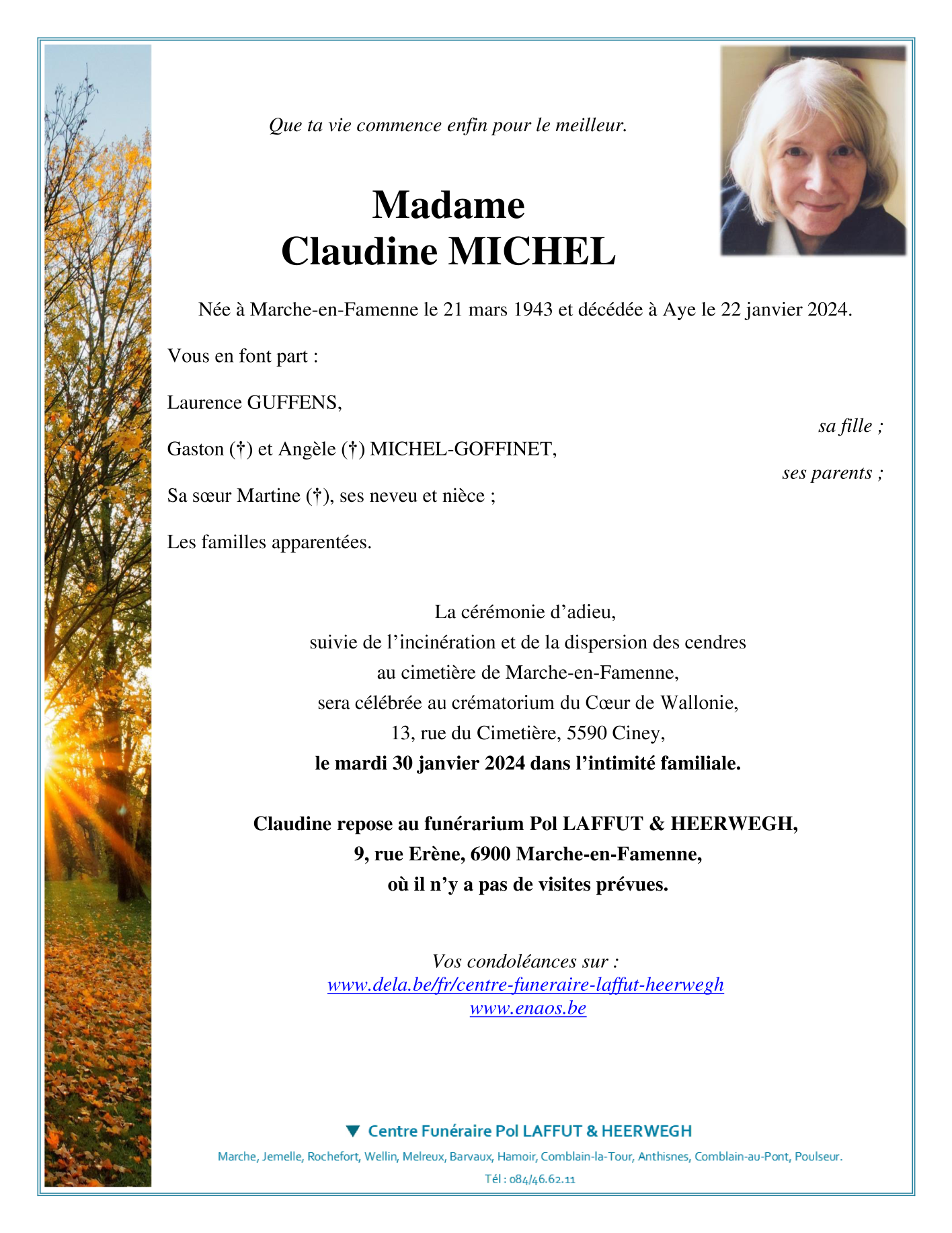 Décédée à Aye (6900) le lundi 22 janvier 2024 à l'âge de 80 ans