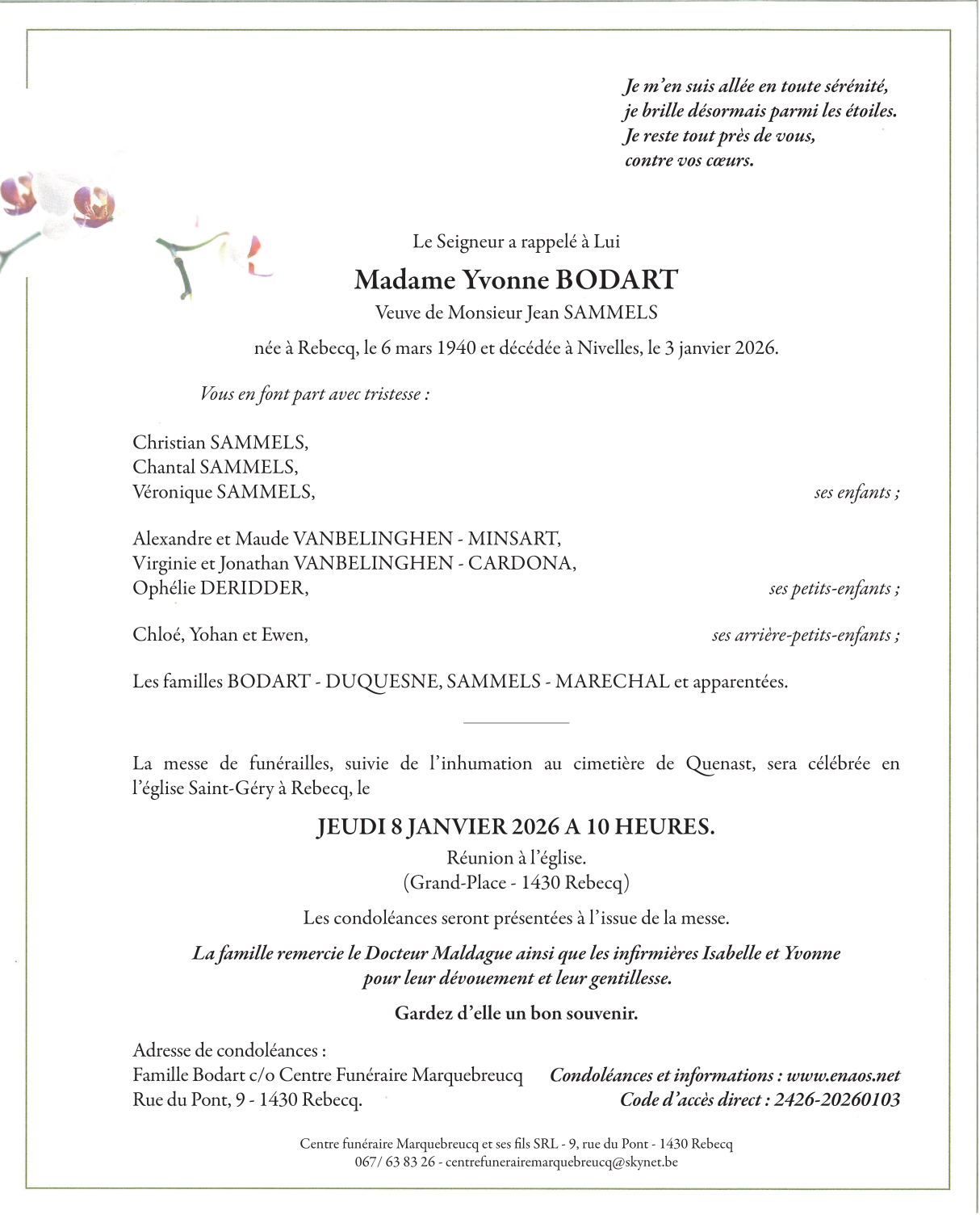 Décédée à Nivelles (1400) le samedi 3 janvier 2026 à l'âge de 85 ans