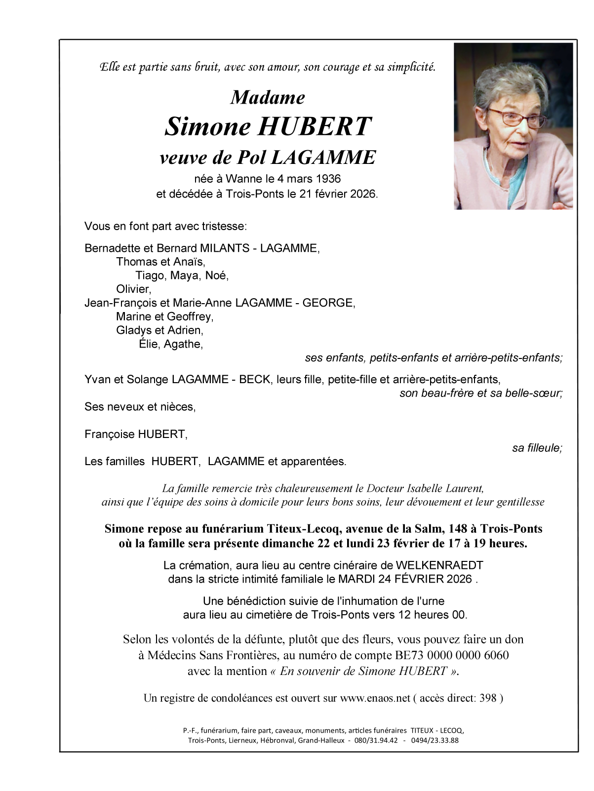 Décédée à Trois-Ponts (4980) le samedi 21 février 2026 à l'âge de 89 ans