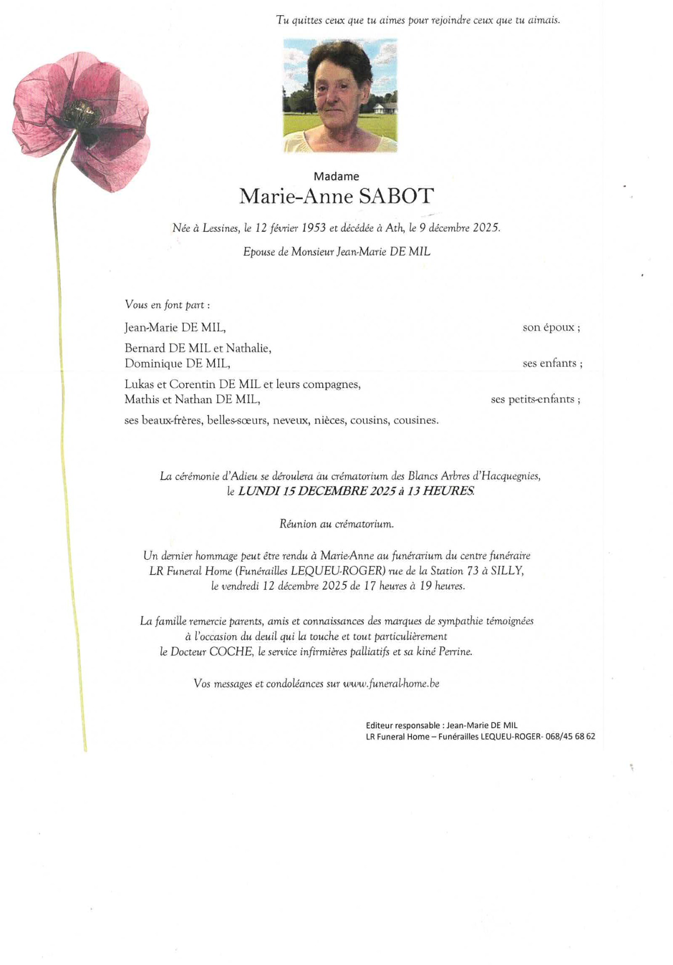 Died in Ath (7800) on 09 December 2025 at the age of 72 years