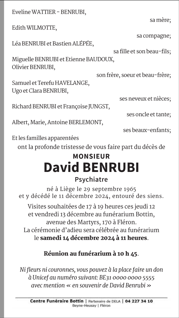 Décédé à Liège (4000) le mercredi 11 décembre 2024 à l'âge de 59 ans