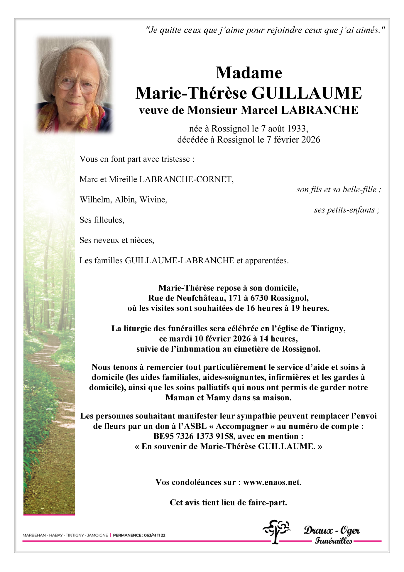 Décédée à Rossignol (6730) le samedi 7 février 2026 à l'âge de 92 ans