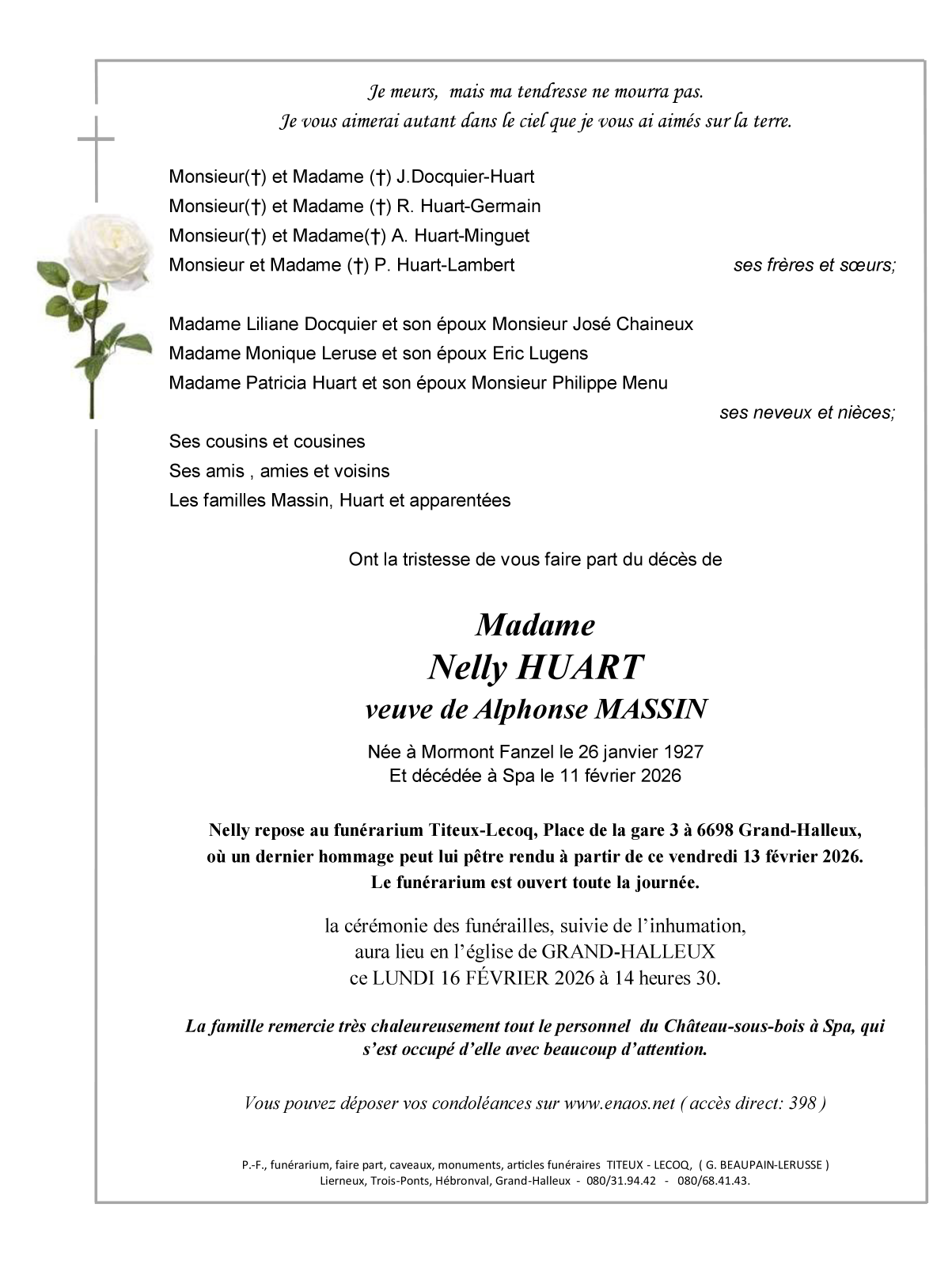 Décédée à Spa (4900) le mercredi 11 février 2026 à l'âge de 99 ans