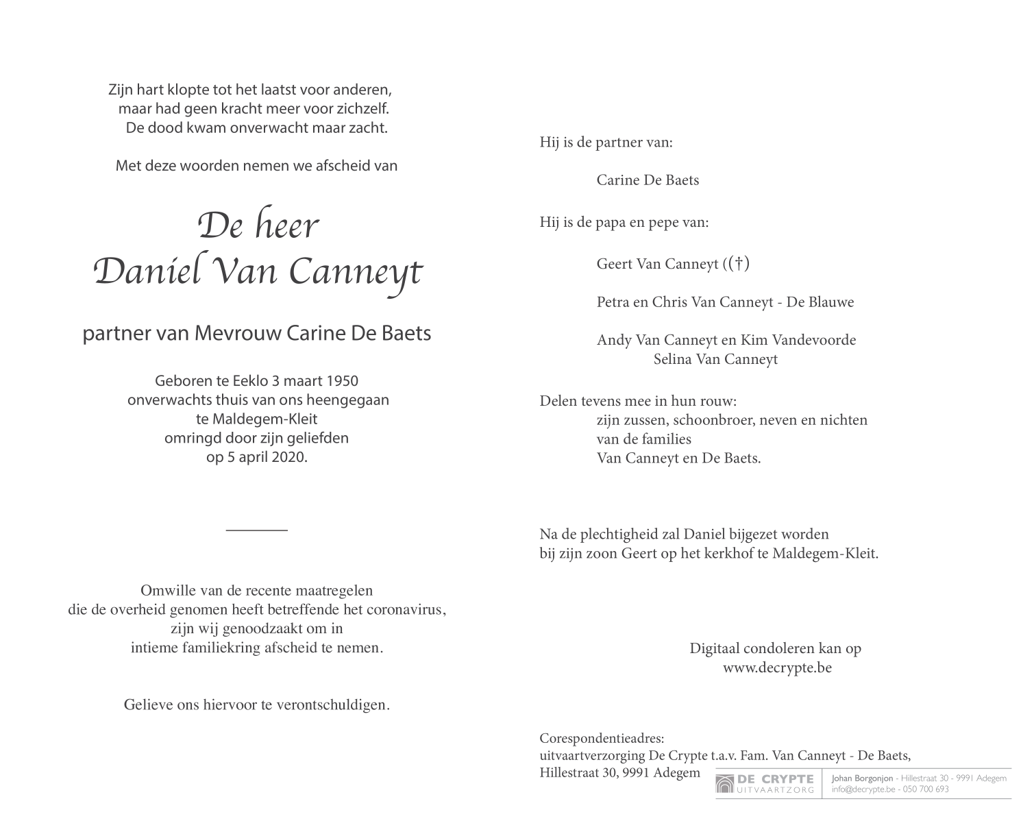 Fallecido en Maldegem-Kleit (9990) el domingo, 5 de abril de 2020 a la edad de 70 años