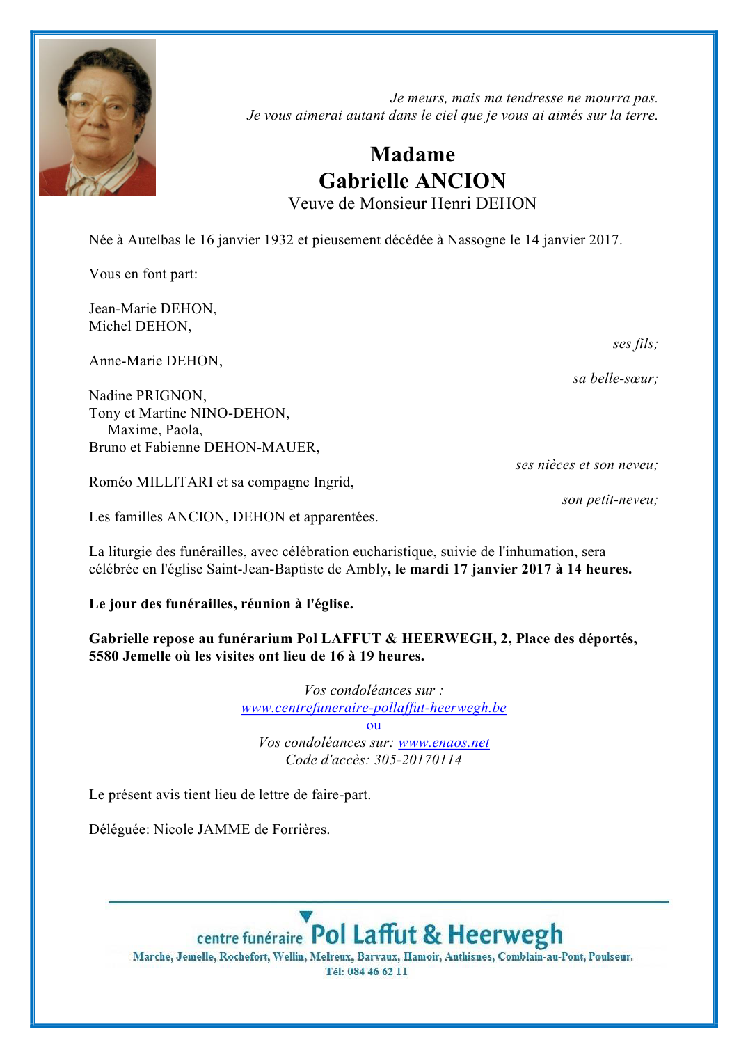 Décédée à Nassogne (6950) le samedi 14 janvier 2017 à l'âge de 84 ans
