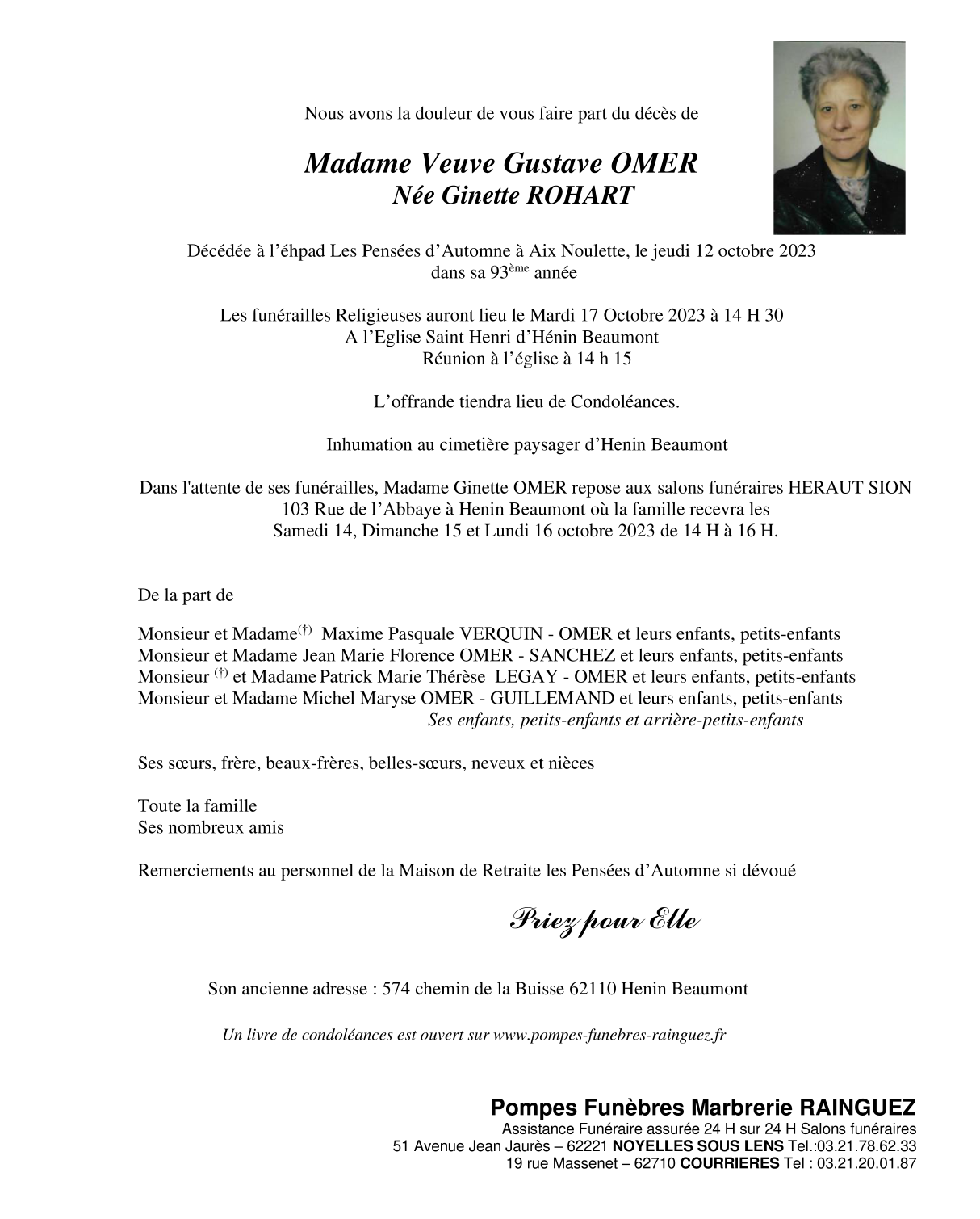 Décédée à Aix-Noulette (62160, France) le jeudi 12 octobre 2023 à l'âge de 92 ans