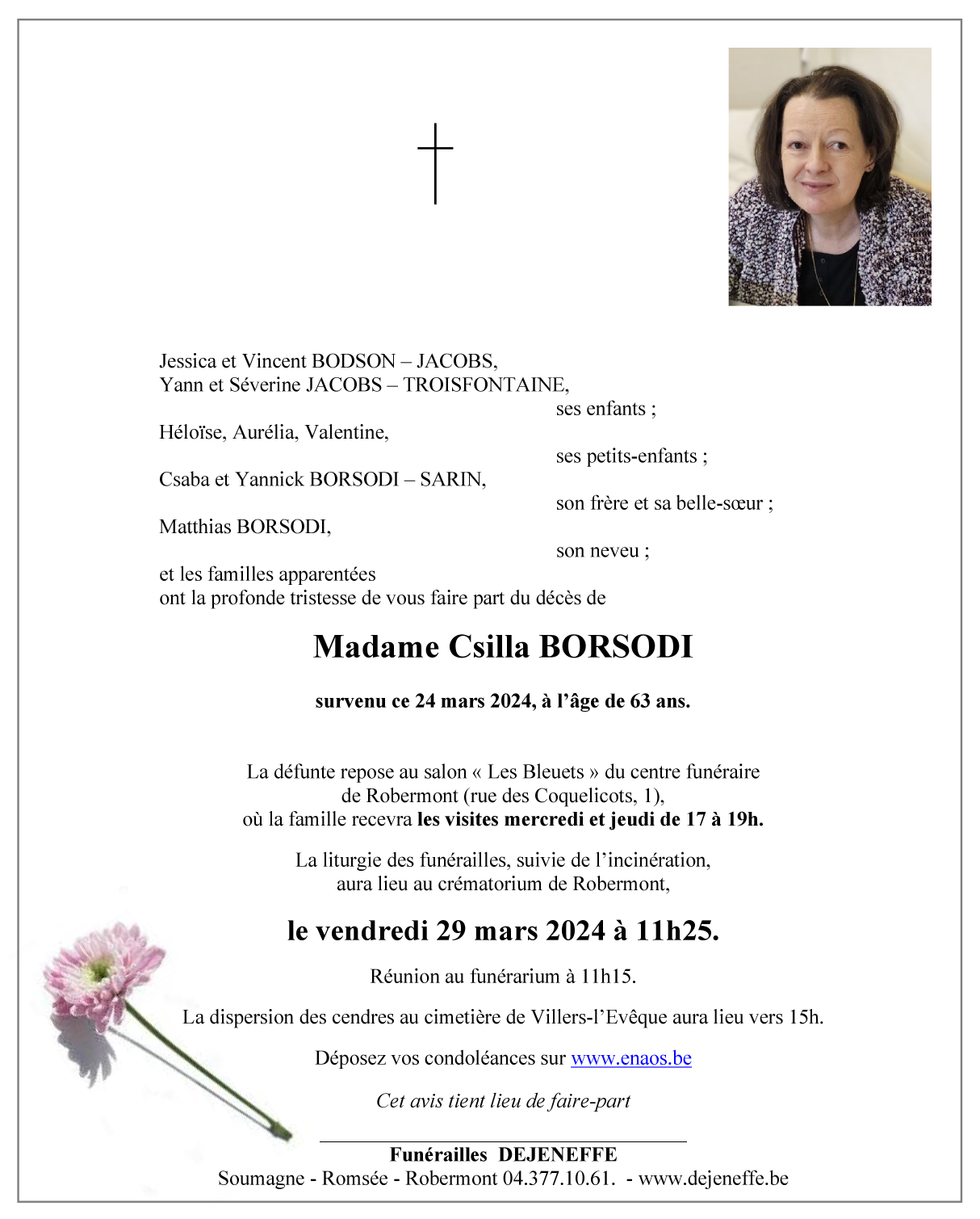 Décédée à Villers-l'Evêque (4340) le dimanche 24 mars 2024 à l'âge de 63 ans