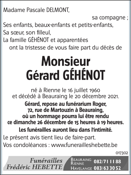 Décédé à Beauraing (5570) le lundi 20 décembre 2021 à l'âge de 61 ans