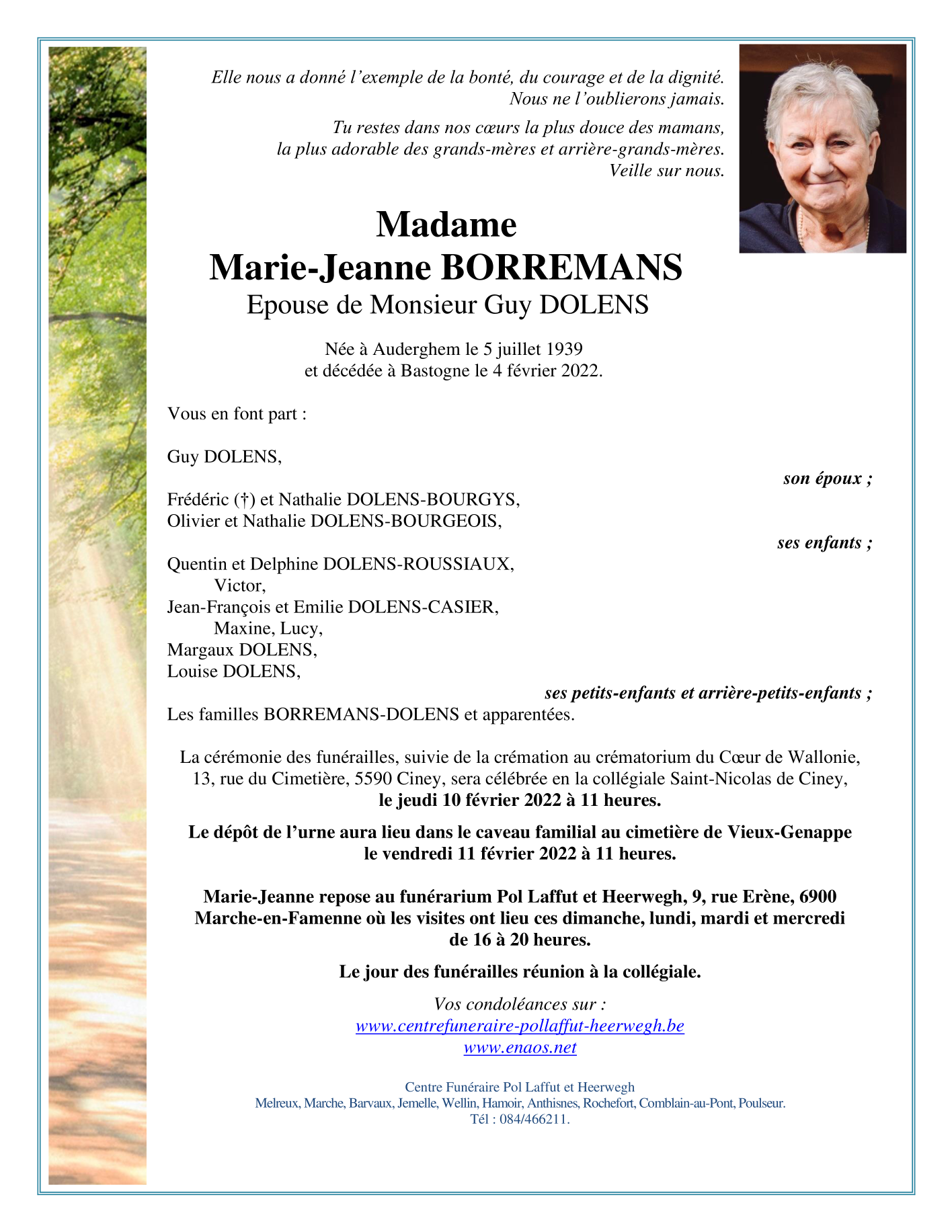 Décédée à Bastogne (6600) le vendredi 4 février 2022 à l'âge de 82 ans