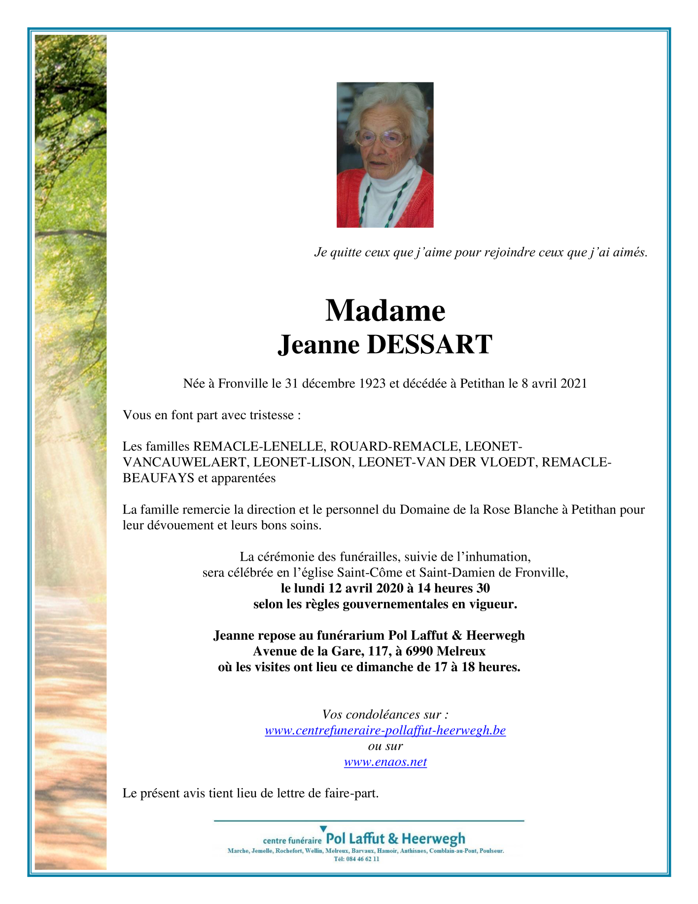 Décédée à Petit-Han (6940) le jeudi 8 avril 2021 à l'âge de 97 ans
