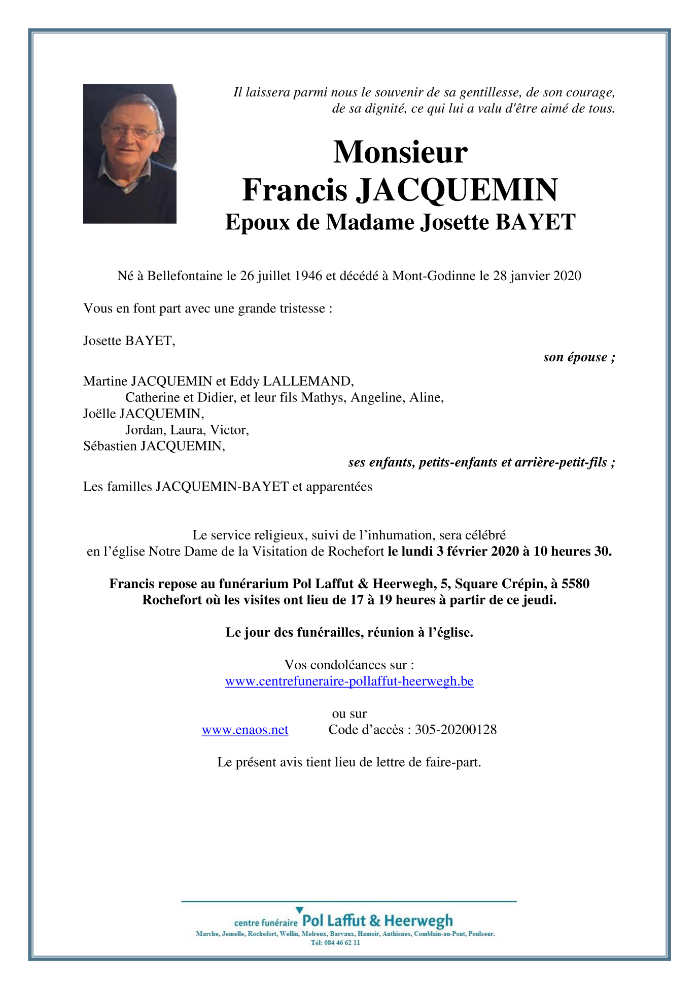 Overleden te Mont-Godinne (5530) op dinsdag 28 januari 2020 op 73-jarige leeftijd