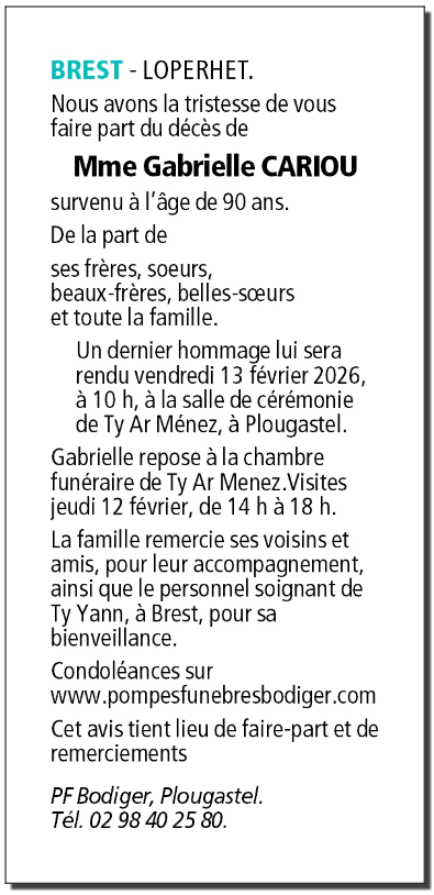 Décédée à Brest (29200, France) le lundi 9 février 2026 à l'âge de 90 ans