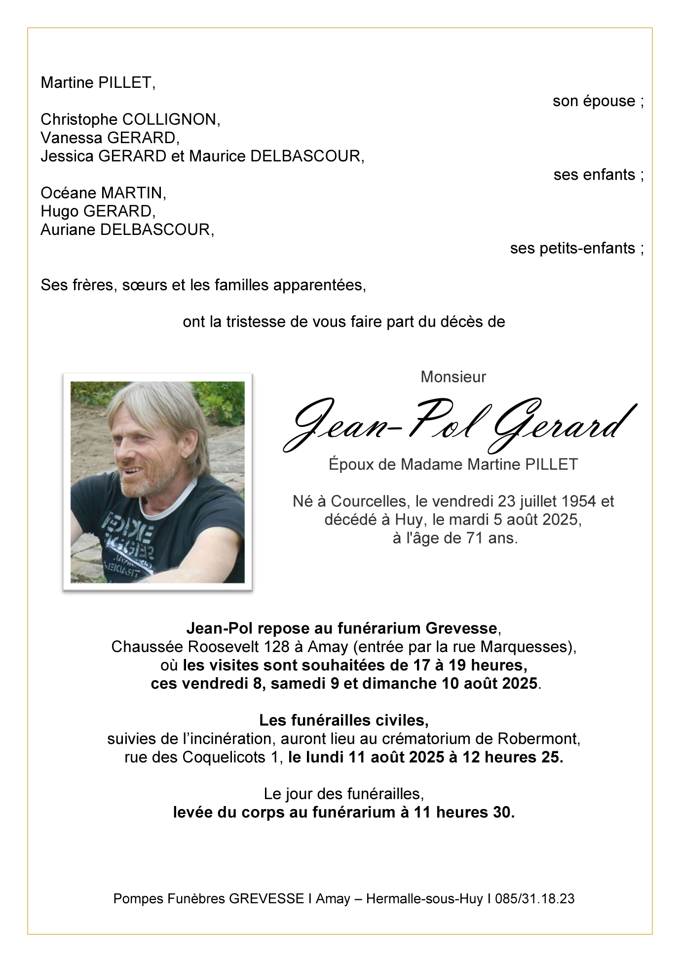 Décédé à Huy (4500) le mardi 5 août 2025 à l'âge de 71 ans