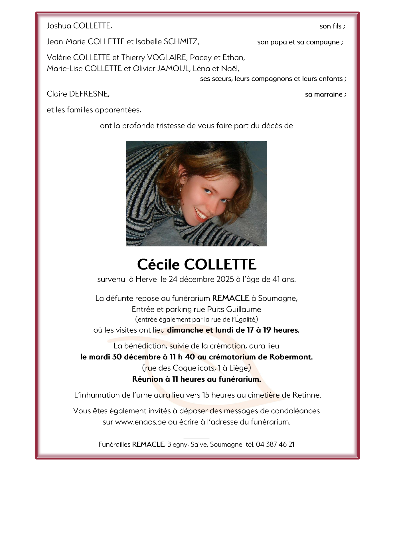Décédée à Herve (4650) le mercredi 24 décembre 2025 à l'âge de 41 ans