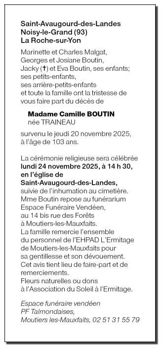 Died in Moutiers-les-Mauxfaits (85540, France) on 20 November 2025 at the age of 103 years