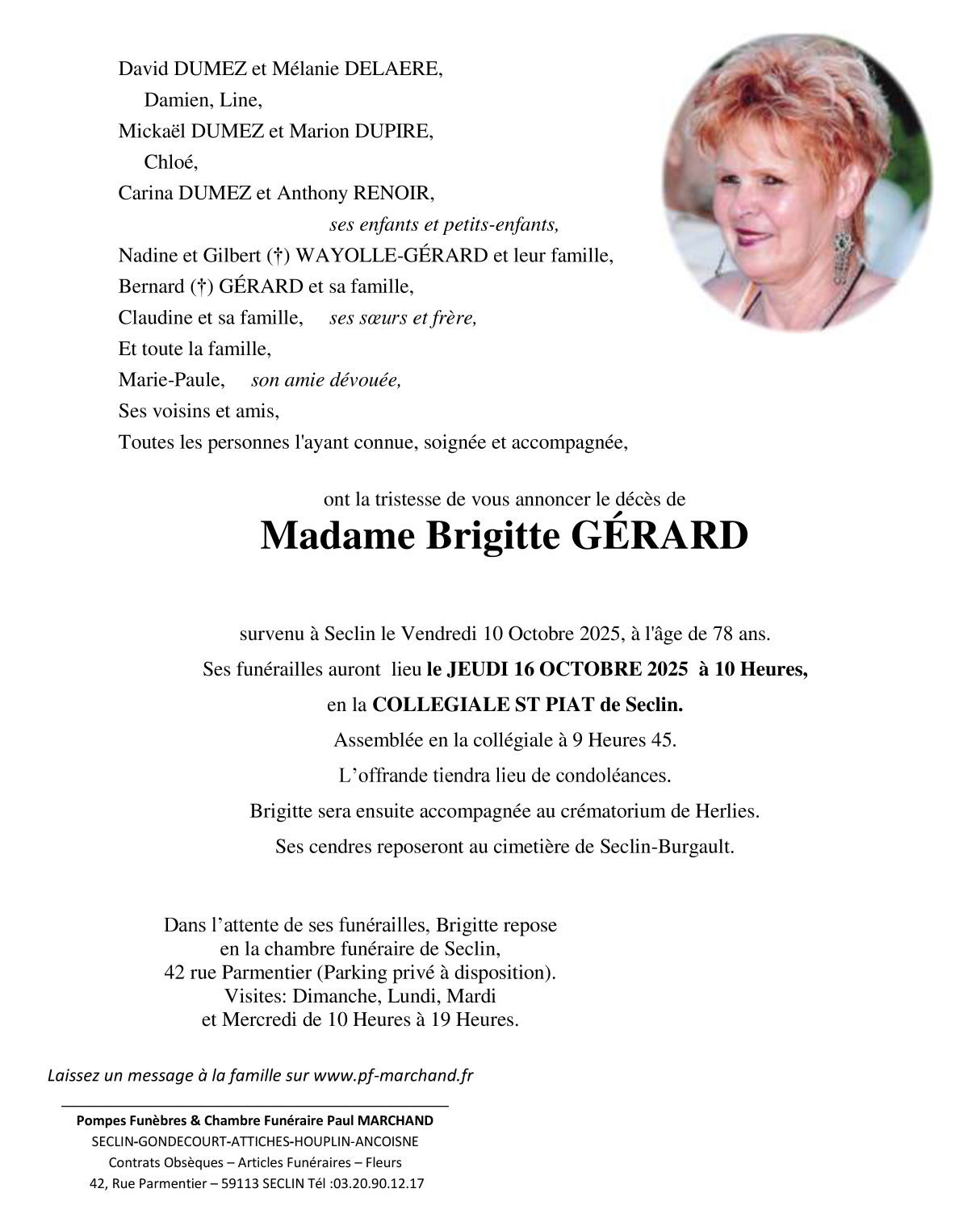 Décédée à Seclin (59113, France) le vendredi 10 octobre 2025 à l'âge de 78 ans
