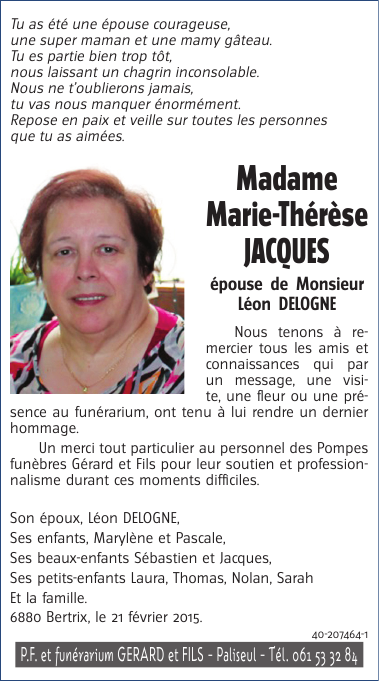 Died in Bertrix (6880) on 01 February 2015 at the age of 64 years