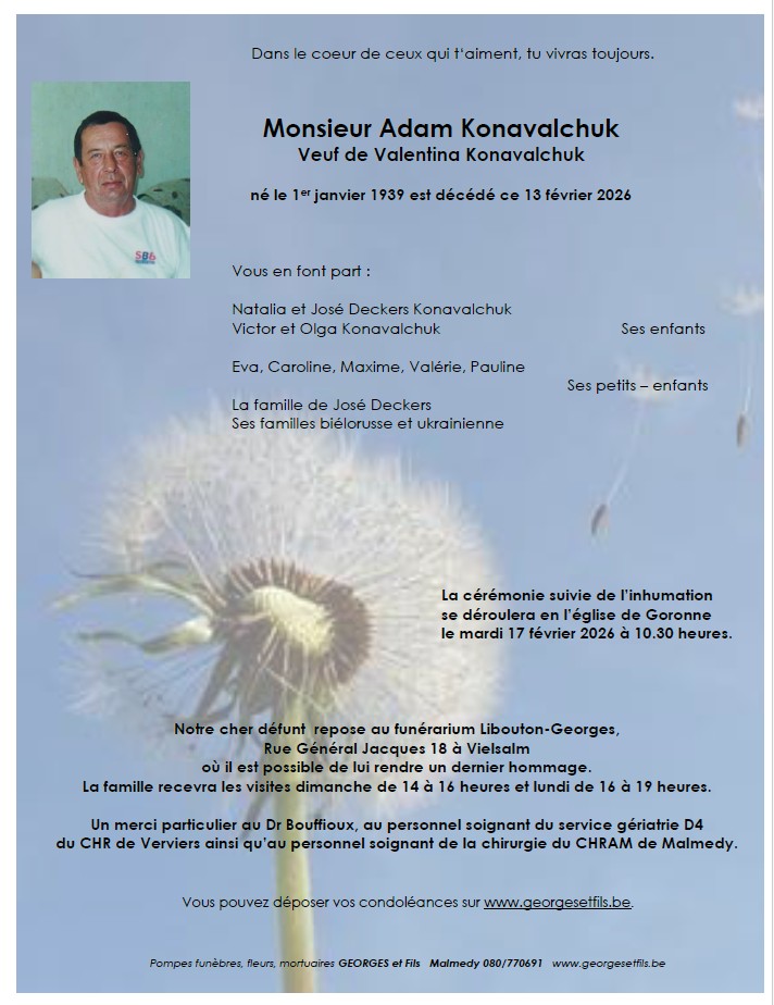 Died in Verviers (4800) on 13 February 2026 at the age of 87 years