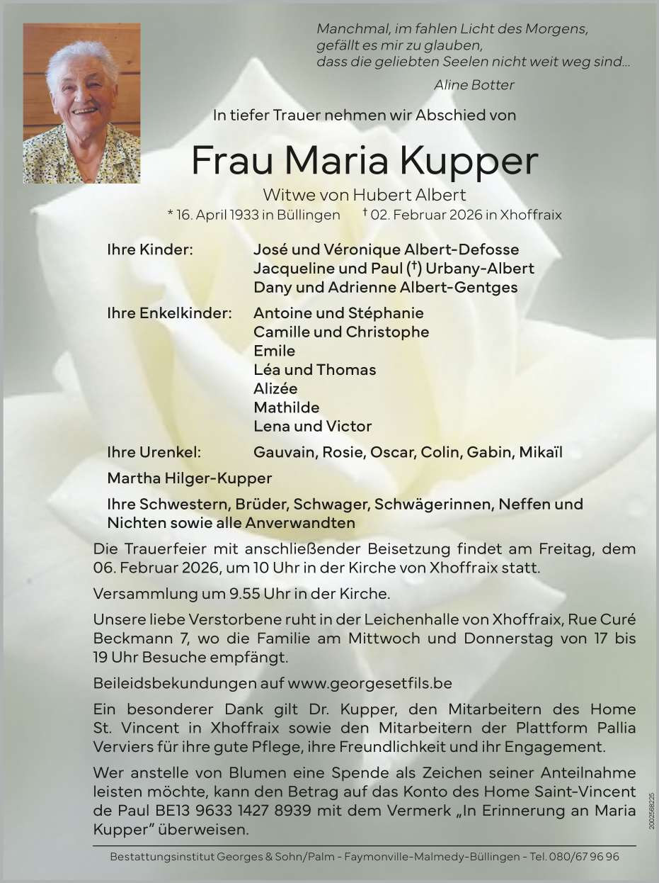 Décédée à Xhoffraix (4960) le lundi 2 février 2026 à l'âge de 92 ans