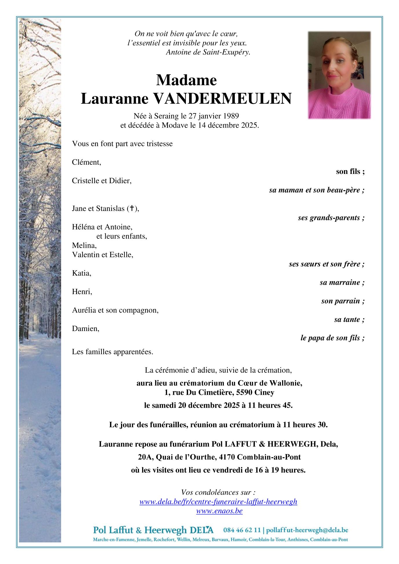 Décédée à Modave (4577) le dimanche 14 décembre 2025 à l'âge de 36 ans
