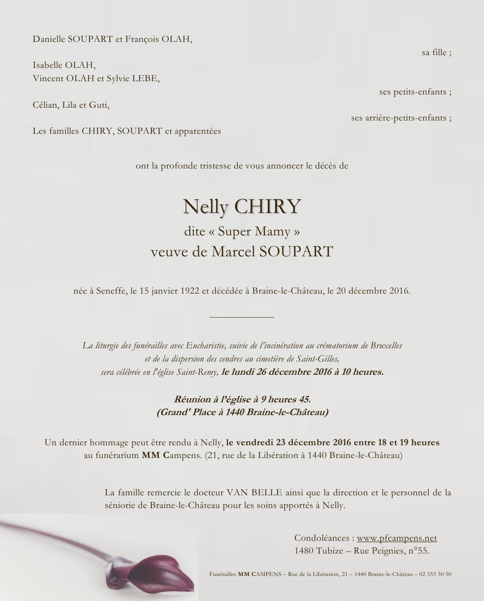 Décédée à Braine-le-Château (1440) le mardi 20 décembre 2016 à l'âge de 94 ans