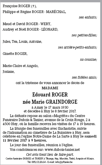 Décédée à Huy (4500) le mercredi 8 février 2017 à l'âge de 86 ans
