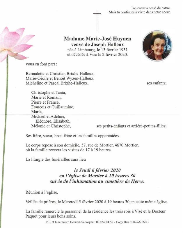 Died in Visé (4600) on 02 February 2020 at the age of 88 years