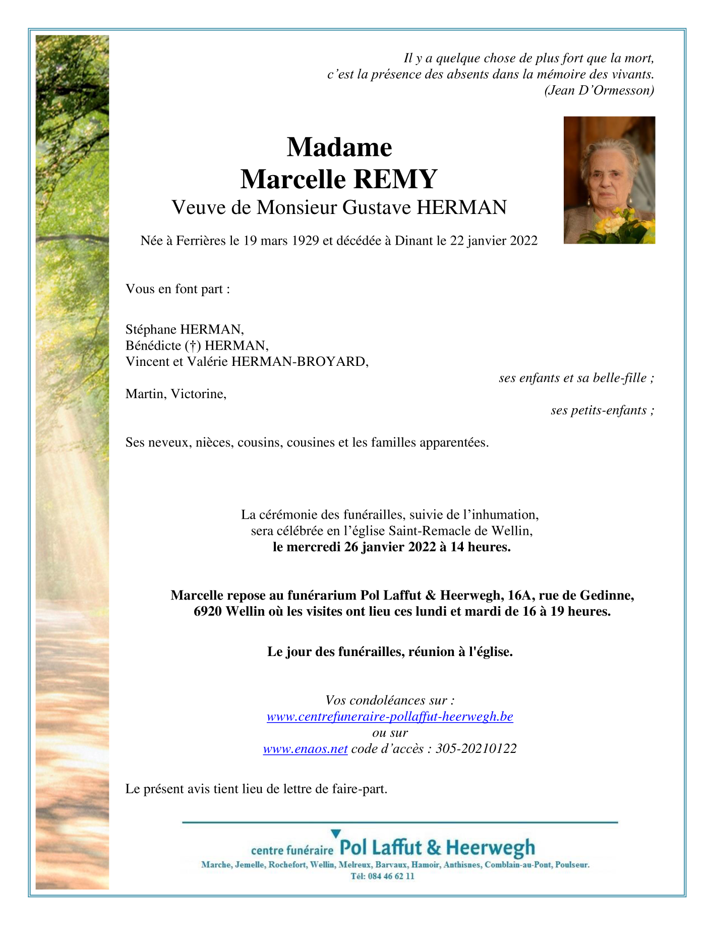 Overleden te Dinant (5500) op zaterdag 22 januari 2022 op 92-jarige leeftijd