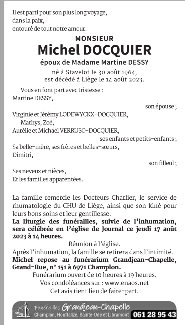 Décédé à Liège (4000) le lundi 14 août 2023 à l'âge de 58 ans