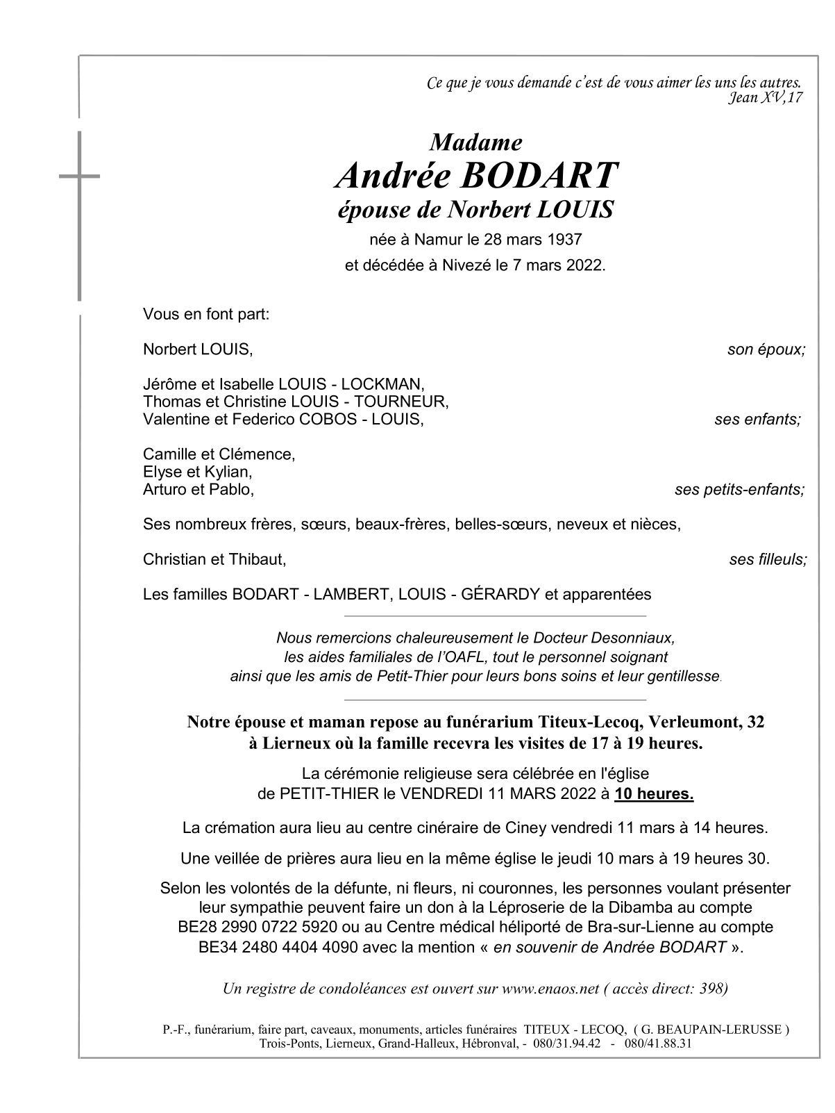 Décédée à Nivezé (4900) le lundi 7 mars 2022 à l'âge de 84 ans