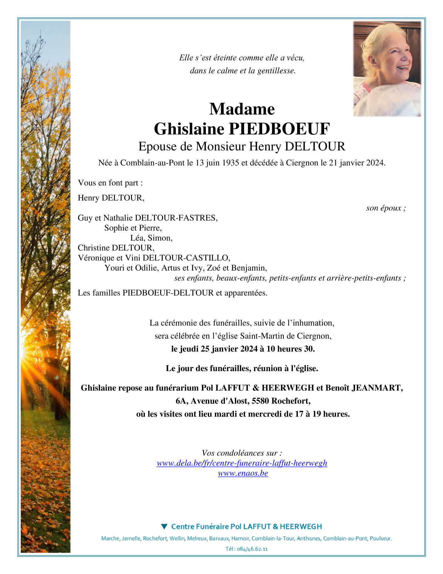 Décédée à Ciergnon (5560) le dimanche 21 janvier 2024 à l'âge de 88 ans