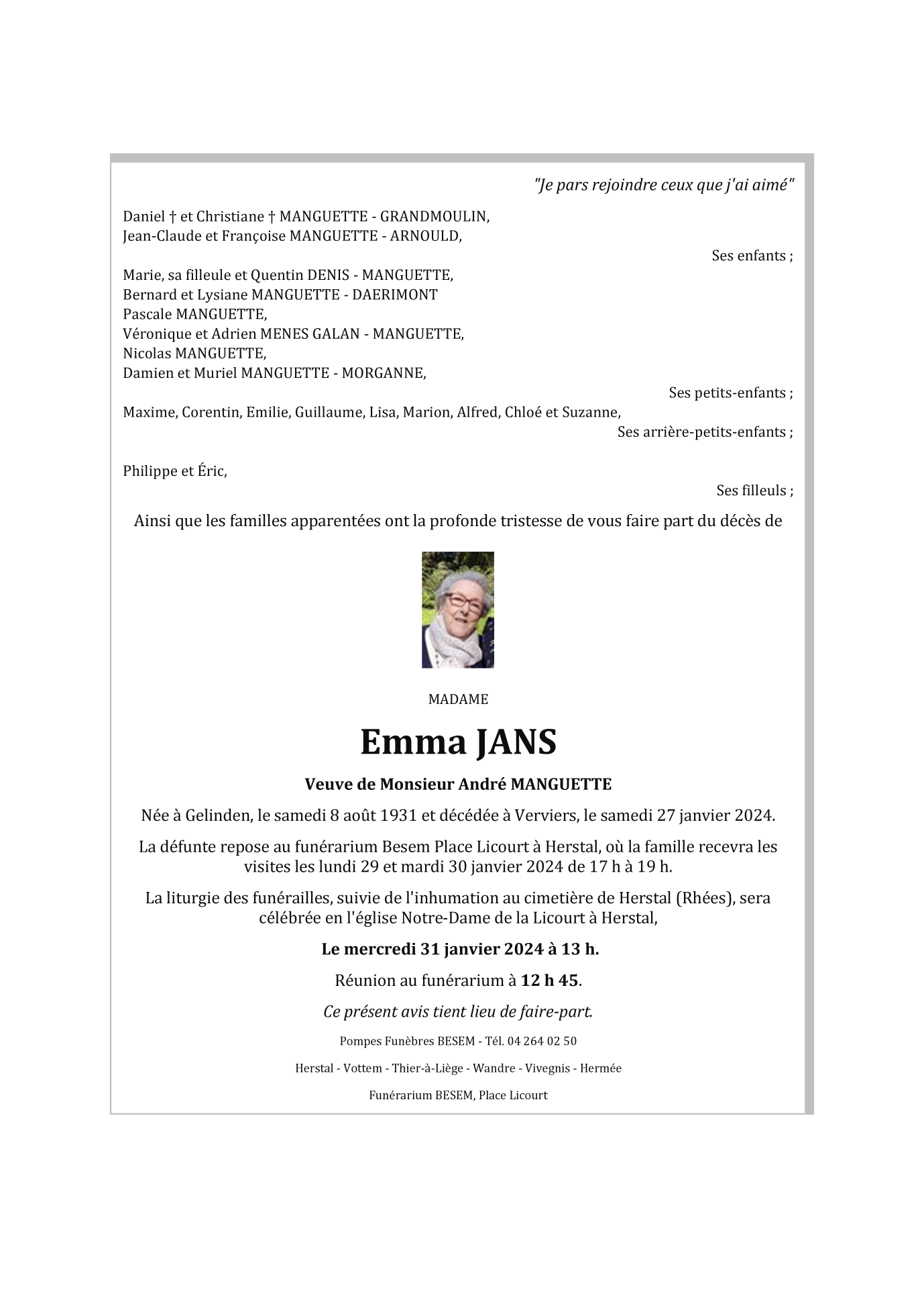 Décédée à Verviers (4800) le samedi 27 janvier 2024 à l'âge de 92 ans