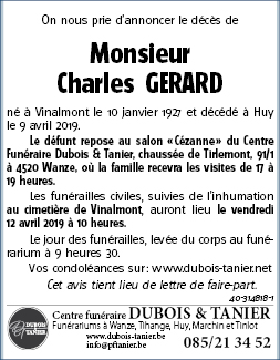 Fallecido en Huy (4500) el martes, 9 de abril de 2019 a la edad de 92 años