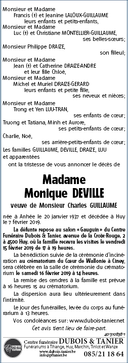 Décédée à Huy (4500) le jeudi 7 février 2019 à l'âge de 82 ans