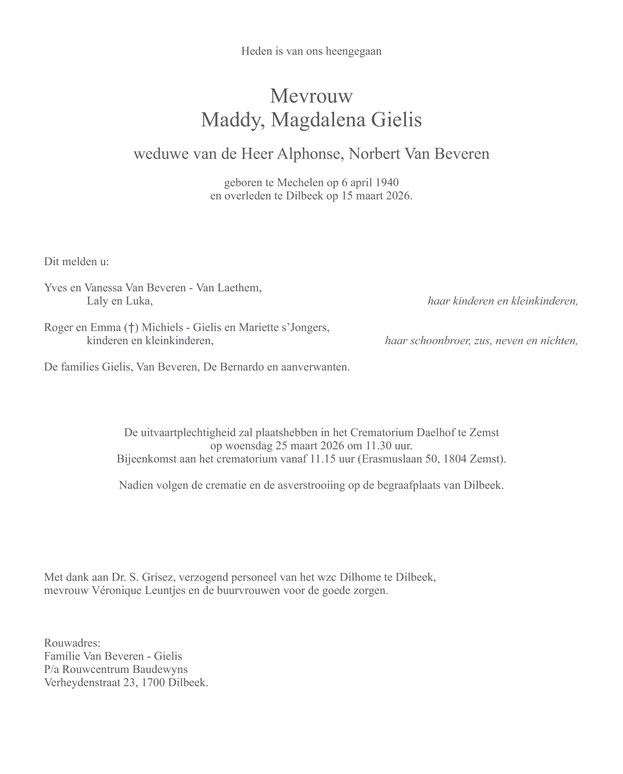 Décédée à Dilbeek (1700) le dimanche 15 mars 2026 à l'âge de 85 ans