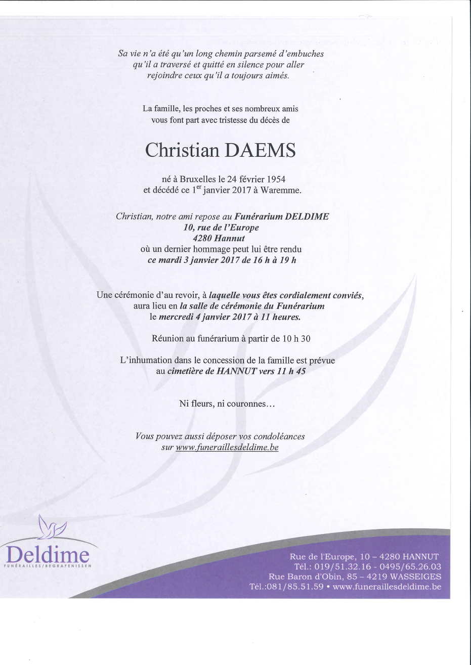 Overleden te Waremme (4300) op zondag 1 januari 2017 op 62-jarige leeftijd