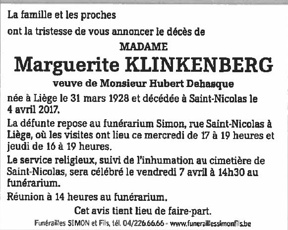 Fallecida en Saint-Nicolas (Lg.) (4420) el martes, 4 de abril de 2017 a la edad de 89 años